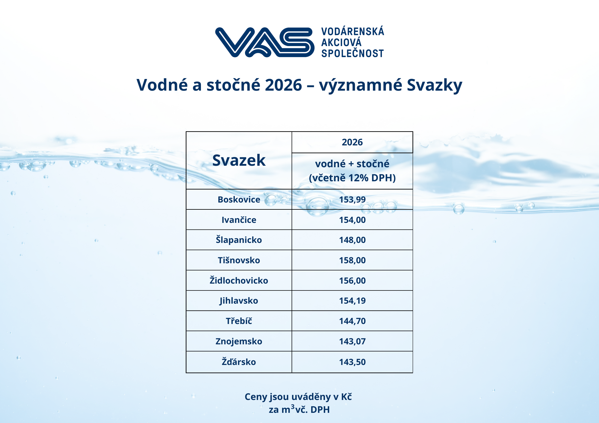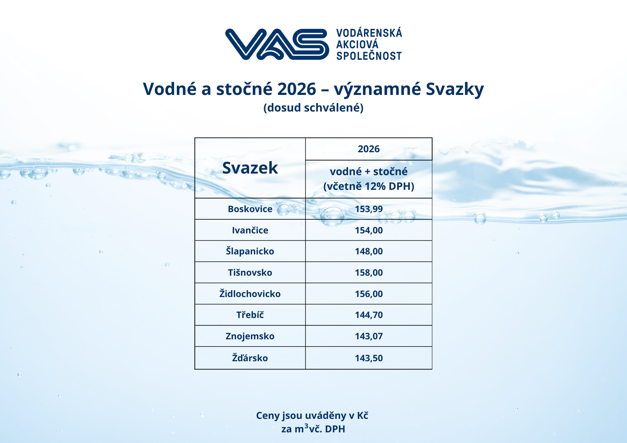 V současné době probíhá schvalování cen za vodné a stočné na rok 2026. U některých významných svazků měst a obcí již byly ceny schváleny, další jsou v jednání, proto budeme postupně aktualizovat.